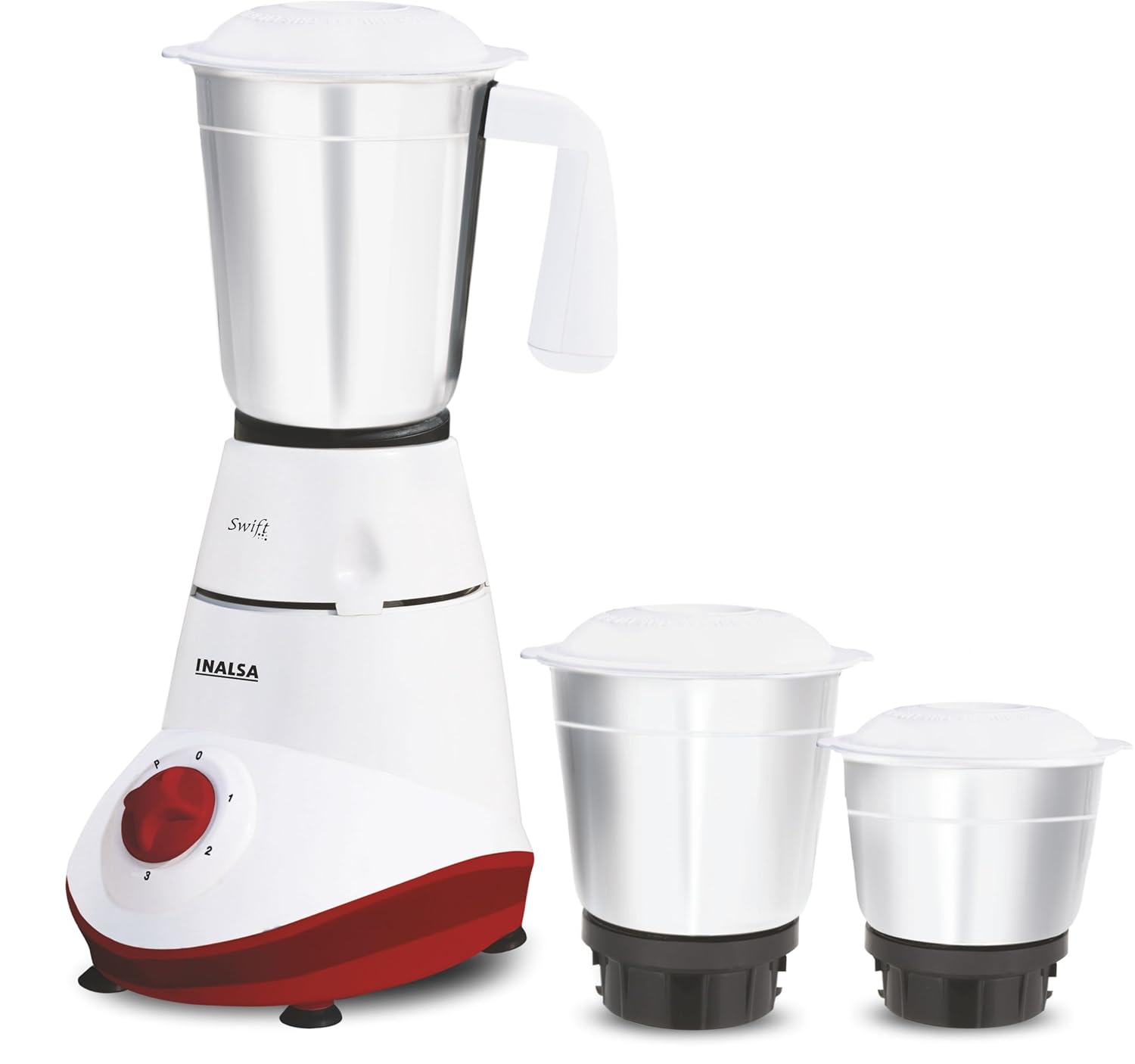 Inalsa Swift 500-Watt Mixer Grinder with 3 Jars (White and Red)