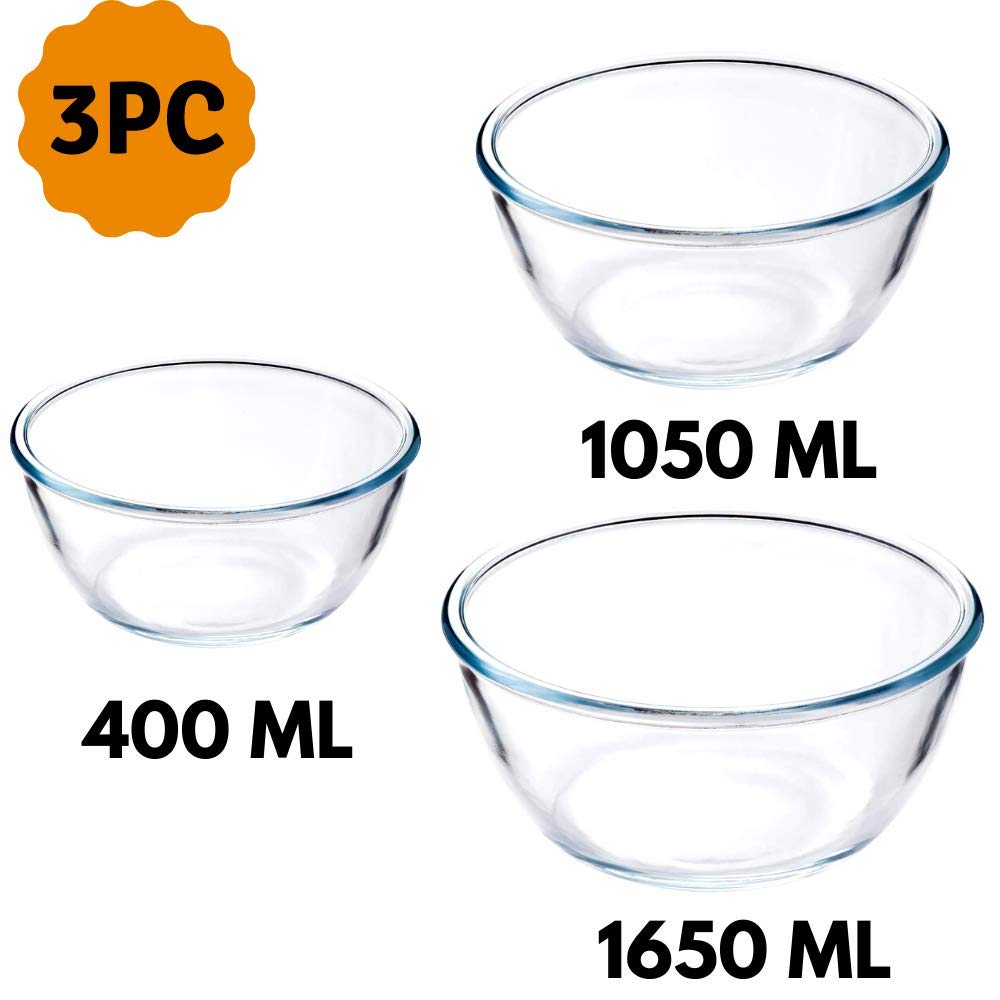 - Material: Borosilicate Glass || Dimensions (cm):- I- 13x7 CM, II- 17x9.5 CM, III- 19x10.5 CM || Capacity(ML):- 400 ML,1050 ML,1650 ML || Package Contents: 3 PCS Mixing Bowl